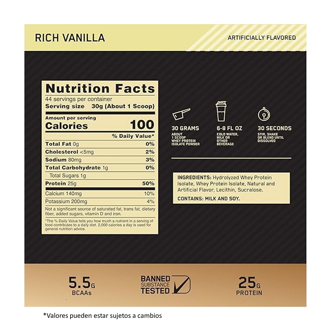 La versión de Gold Standard hecha con proteína 100% aislada de suero de leche. Sometida a procesos de ultra filtrado e hidrolizado para conseguir una pureza excepcional y una absorción óptima; también incluye aminoácidos ramificados que nos ayudarán a construir y mantener fibras musculares con nutrientes de la más alta calidad y reconocimiento.