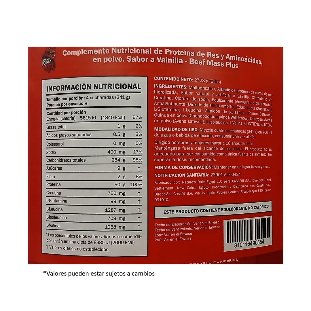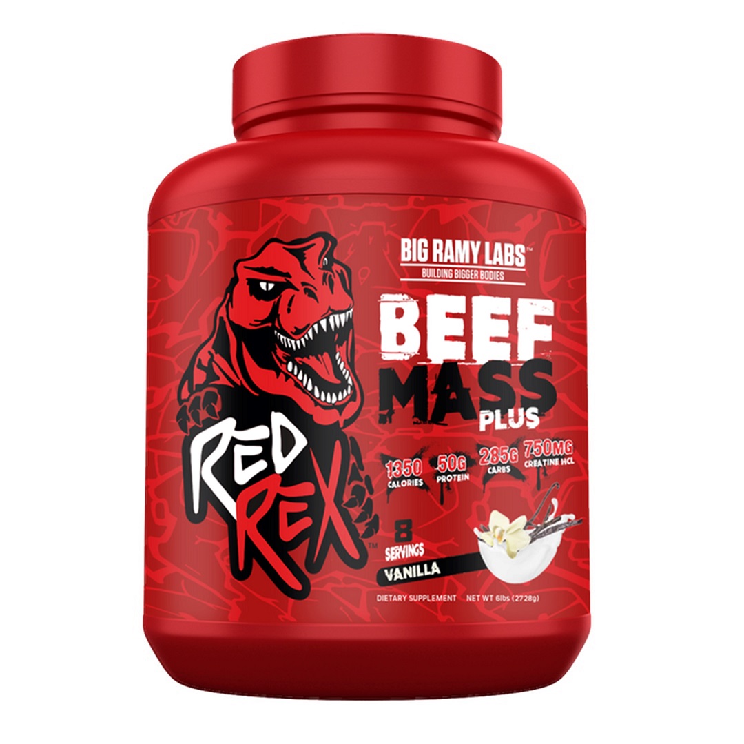 Beef Mass Plus es un ganador de masa muscular cuya fuente de proteína es  la carne de res. Pertenece a la marca Red Rex del  aclamado fisicoculturista y 2 veces Mr. Olimpia Big Ramy. La fórmula de Beef Mass Plus aporta una serie de componentes claves para la ganancia de masa muscular entre los que se destaca el aislado de proteína de carne de res hidrolizado, maltodextrina, clorhidrato de creatina o creatina HCL, además de aminoácidos importantes como la glutamina, leucina, isoleucina y valina.
